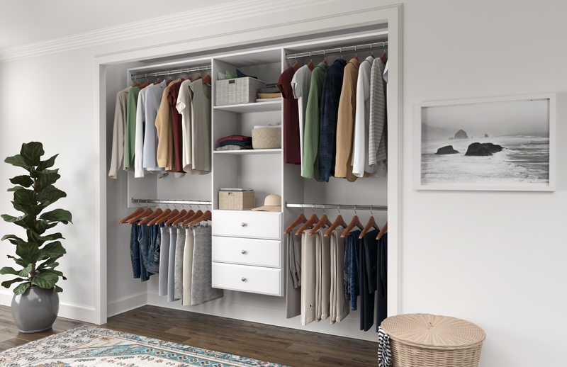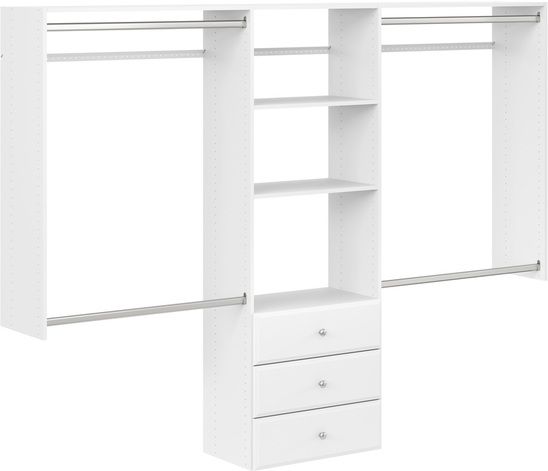 This Easy Track closet kit is the most complete closet kit available online. This kit includes three 8-inch high drawers as well as 14-feet of shelf space and 12-feet of hanging space. Need an easy install? The Easy Track closet system hangs on a single wall mounted steel rail and comes with all of the required installation hardware.