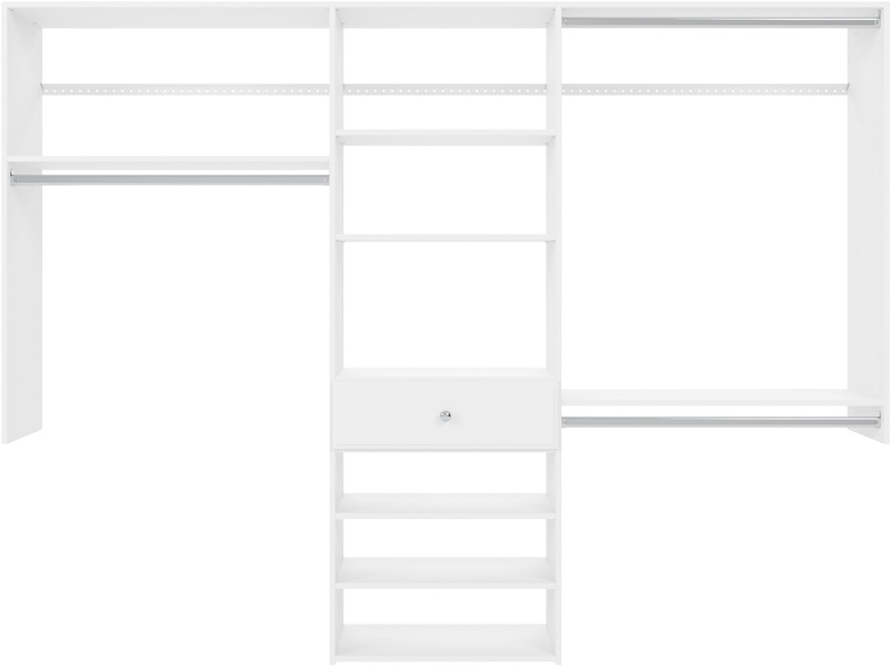 Easy Track's made to be your easy-to-install, reach-in dream! The 8ft., 7ft. and 6 ft. kits were designed to fit into a variety of reach-in spaces. Each kit includes both double-hanging and long-hanging space for dresses, button ups and more. Shelving to hold sweaters, denim, shoes and miscellaneous belongings. And for some hidden storage, a drawer. Enjoy the durable, scratch-resistant laminate material and in White to brighten up any space.
