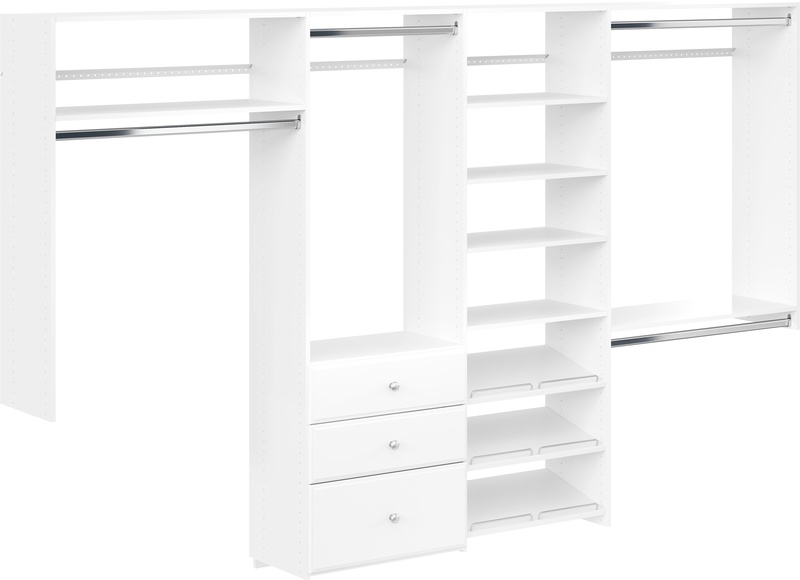 The 10 ft. Dual Tower Deluxe Kit is easy installation and organization from beginning to end. This box includes a premier kit designed to meet most closet organization needs by creating designated space for each item. Open and adjustable shelving stores stacks of sweaters, denim, bags and leaves room for bigger items like travel bags. Slanted shoe storage is predetermined space to keep favorite footwear off the floor. A drawer bank catches small items and provides hidden storage. And hanging space offers quick access to shirts, dresses and slacks. For an easy install, the Dual Tower Deluxe Kit hangs on wall-mounted steel rails and comes with all of the required installation hardware.